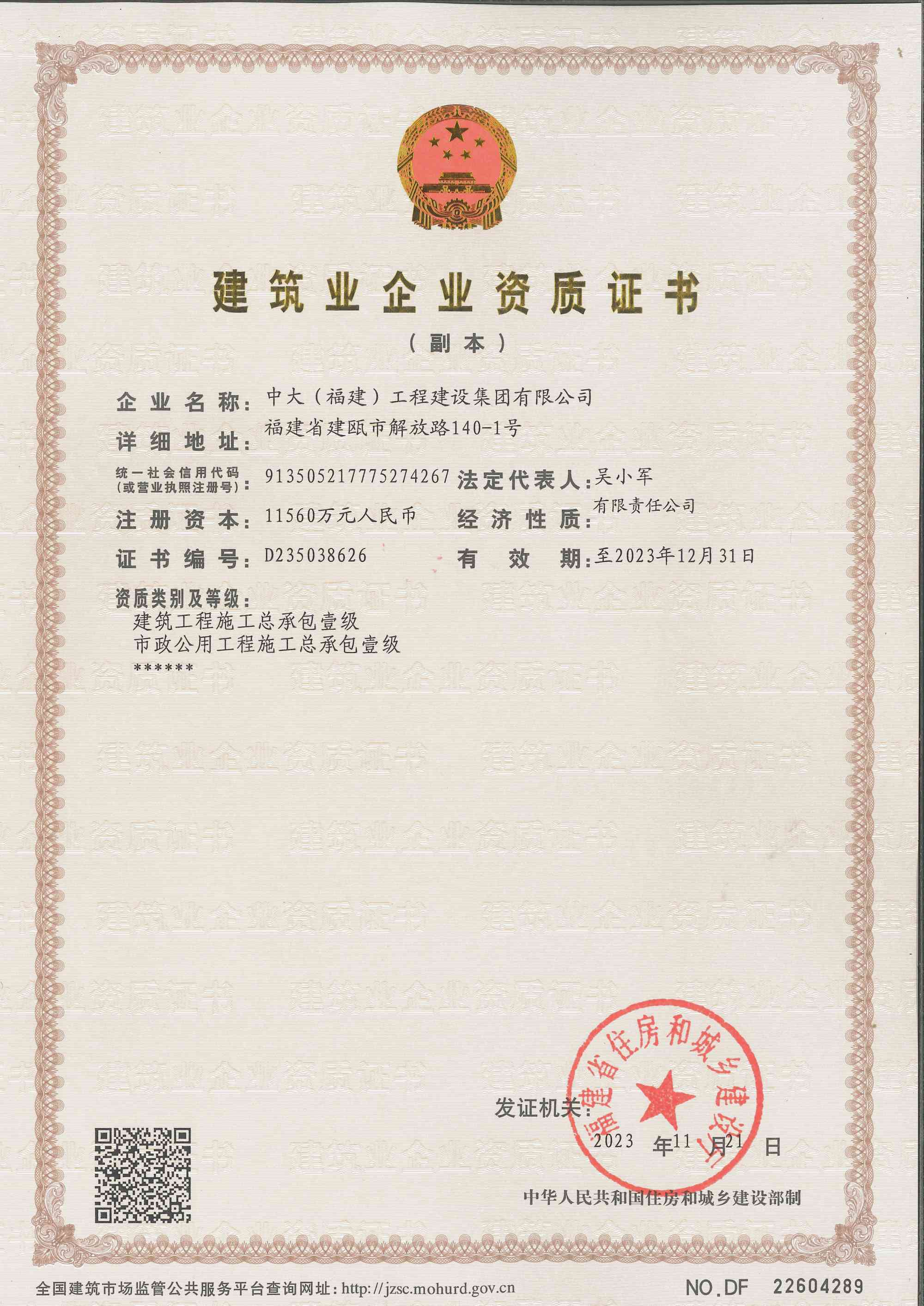 中大(福建)工程建設集團有限公司始建于1997年,總部設在“中國筍竹之都”——福建省南平市建甌市。公司注冊資本金11560萬元,年施工產值15億元以上?,F有公司資質:房屋建筑工程施工總承包一級、市政公用工程施工總承包一級、地基基礎工程專業承包壹級、消防設施工程專業承包壹級、建筑裝修裝飾工程專業承包壹級、建筑機電安裝工程專業承包壹級、環保工程專業承包壹級,并取得質量、環境和職業健康安全管理體系認證。